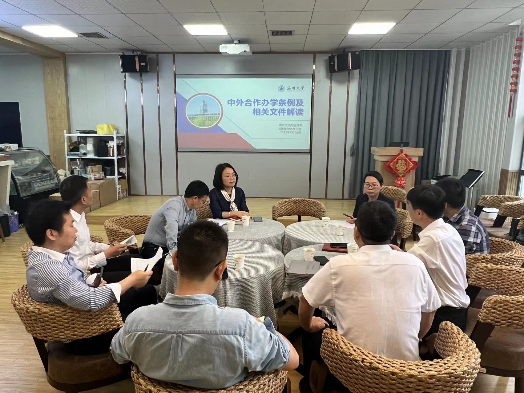 对国际交流与合作处黄文浩处长一行的来访表示热烈欢迎。黄文浩处长首先介绍了此次调研座谈的目的以及国际交流与合作处的相关工作安排,并着重介绍了中外合作办学的背景、中外合作办学条例及相关文件解读、浙江省中外合作办学情况以及推进国产自拍