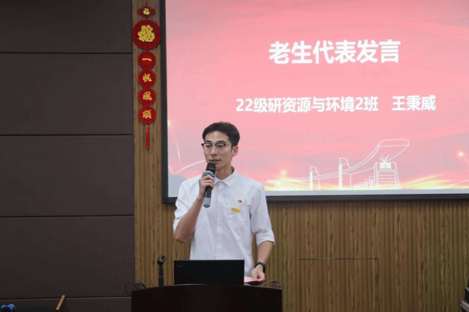 老生代表22资源与环境班王秉威同学发言。他分享从参与研究生创新基金到发表SCI一区论文的经历,和学弟学妹们共勉,要始终坚持“求学问是、敢为人先”的精神,做有价值国产自拍