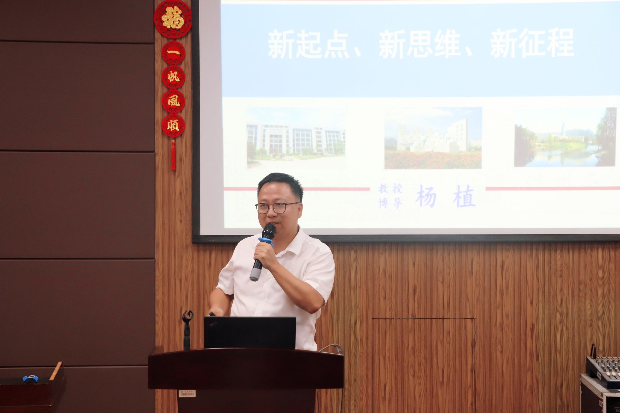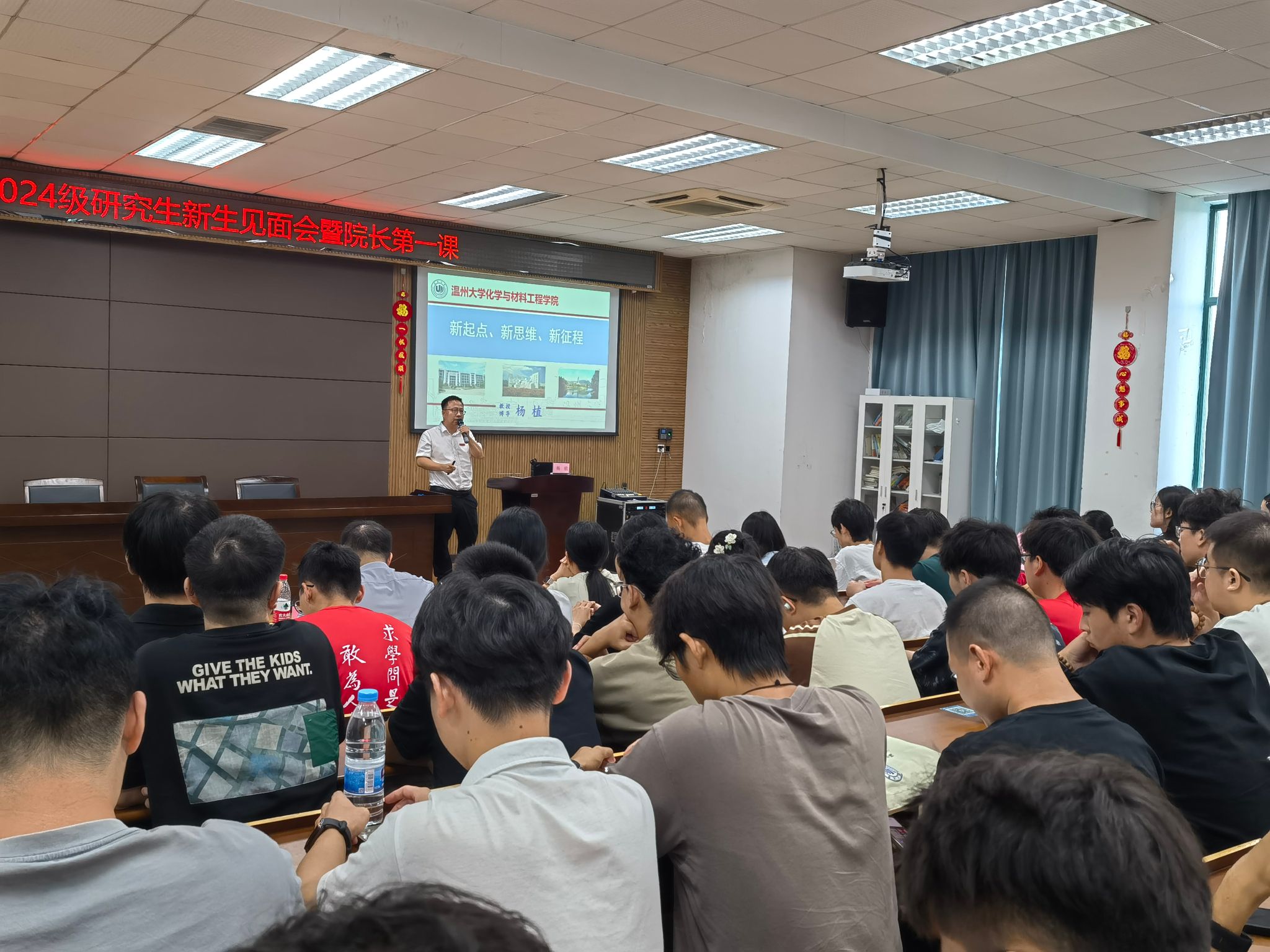杨植院长为全体研究生新生上院长第一课,他先向265名新生送上最衷心的欢迎和最热烈的祝贺,并为新生导学畅游精妙化学、生动材料世界,引领开启学习研究新篇。他以“新起点、新思维、新征程”为题,生动介绍了温州精神、国产自拍