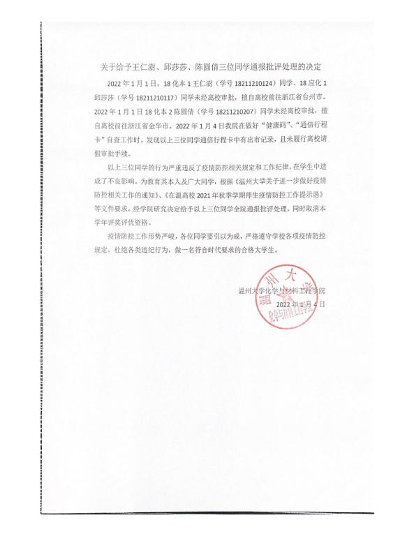 关于给予王仁澍、邱莎莎、陈圆倩三位同学通报批评处理的决定