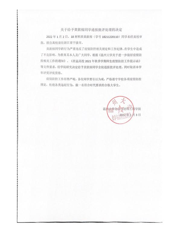 关于给予王仁澍、邱莎莎、陈圆倩三位同学通报批评处理的决定