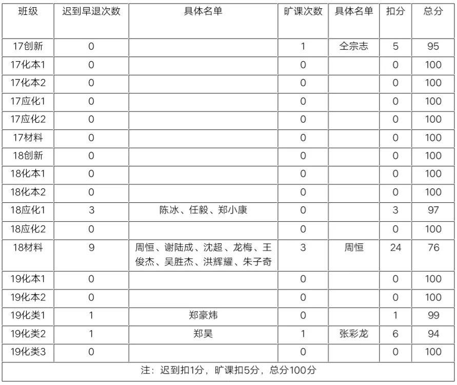 为保证疫情期间线上教学顺利展开、加强我院的学风建设、督促学生按时参与线上课程,现对2019-2020学年第二学期第十周考勤情况进行通报。每天由各班负责人统计各科出勤情况并上报,最终一周的考勤情况于每周五进行汇总公布。