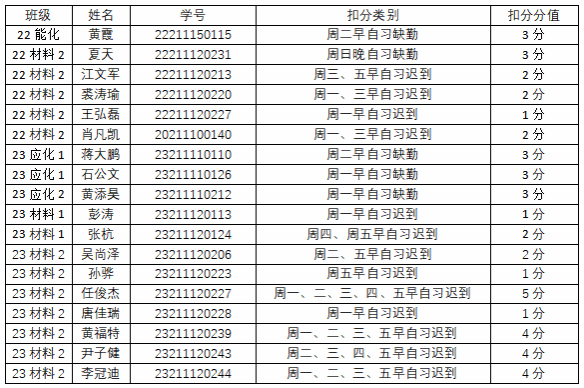 第11周早晚自习考勤情况最终结果公布如下: