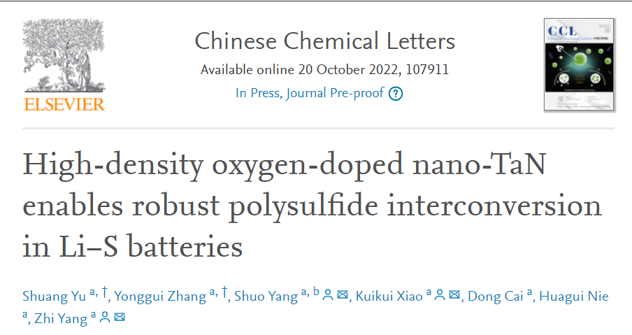 相关研究成果以“High-density oxygen-doped nano-TaN enables robust polysulfide interconversion in Li−S batteries”为题发表在《Chinese Chemical Letters》(IF=8.455)上,国产自拍