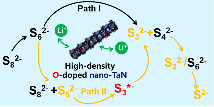 氮化钽(TaN)因其带隙窄、过电位低、化学稳定性高等优点,被广泛应用于氧还原等电催化反应。尽管TaN在锂硫电池中具有很高的催化硫氧化还原反应的潜力,但TaN在锂硫电池中的应用研究尚未见报道。为了解决锂硫电池中的穿梭效应和反应动力学迟缓的问题,我院杨植教授团队开发了一种多孔高密度氧掺杂氮化钽纳米结构(nano-TaNO)作为高效催化剂应用于锂硫电池中。nano-TaNO内部和表面都形成了均匀的纳米孔通道,具有储存更多的硫物种、易于电解液渗透和良好的电子/Li+传输等优点。更重要的是nano-TaNO中高密度O掺杂不仅提供了高导电性,还通过Li−O化学相互作用和激发S3*−自由基的生成促进了多硫化物的吸附/转化,开辟了从S8到Li2S新的转化路径。因此,即使在高硫负载条件下,nano-TaNO正极也表现出优异的比容量和可循环性。该项工作表明,氮化钽和大量阴离子掺杂工程在调控多硫化物中间体的形成和制造高性能锂硫电池方面具有巨大的潜力。